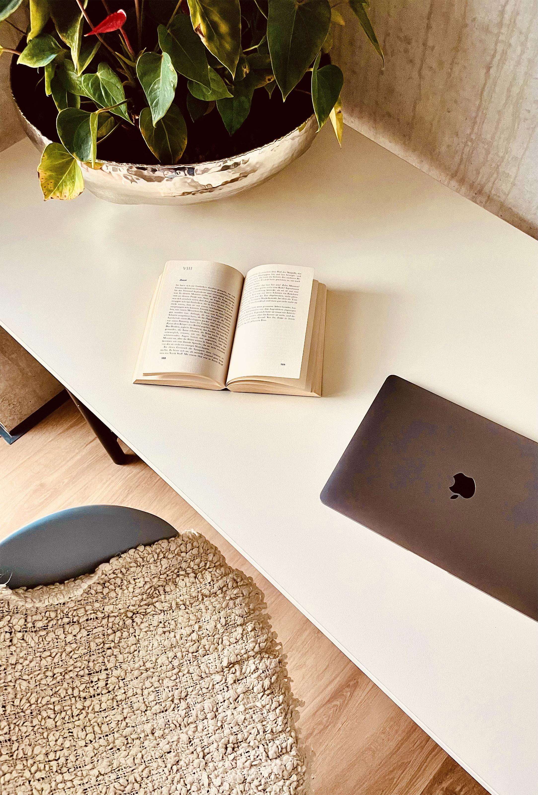- Schreibtisch mit großer Arbeitsfläche und Hängeregal