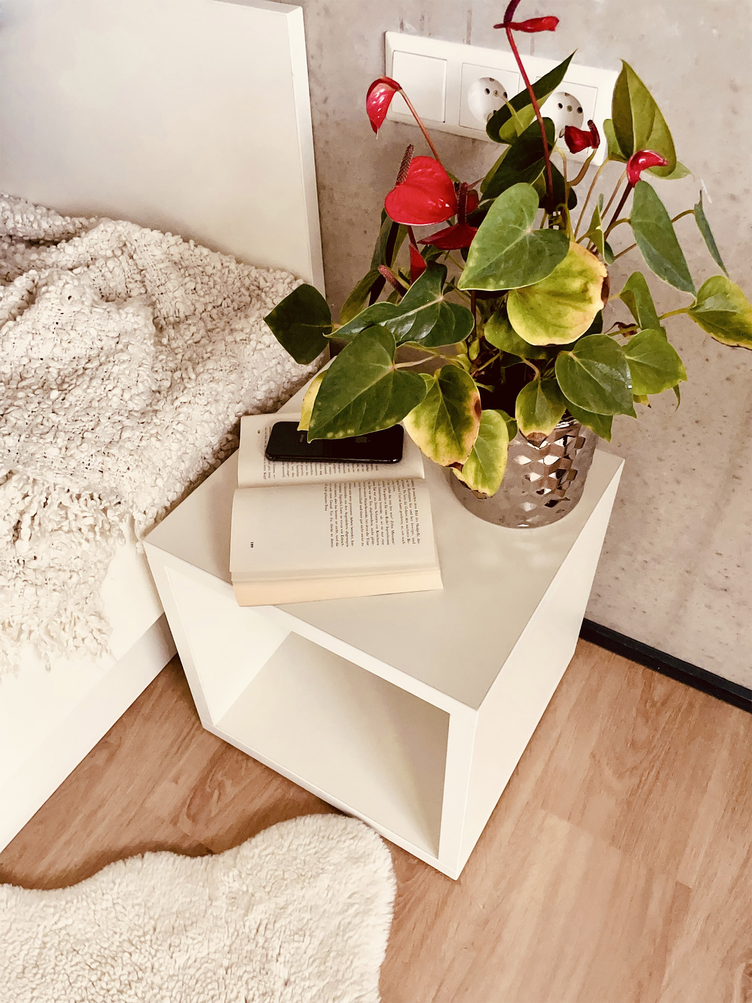 - Bett (140 × 200 cm) inkl. Matratze und Nachttisch, der zudem als Hocker dienen kann